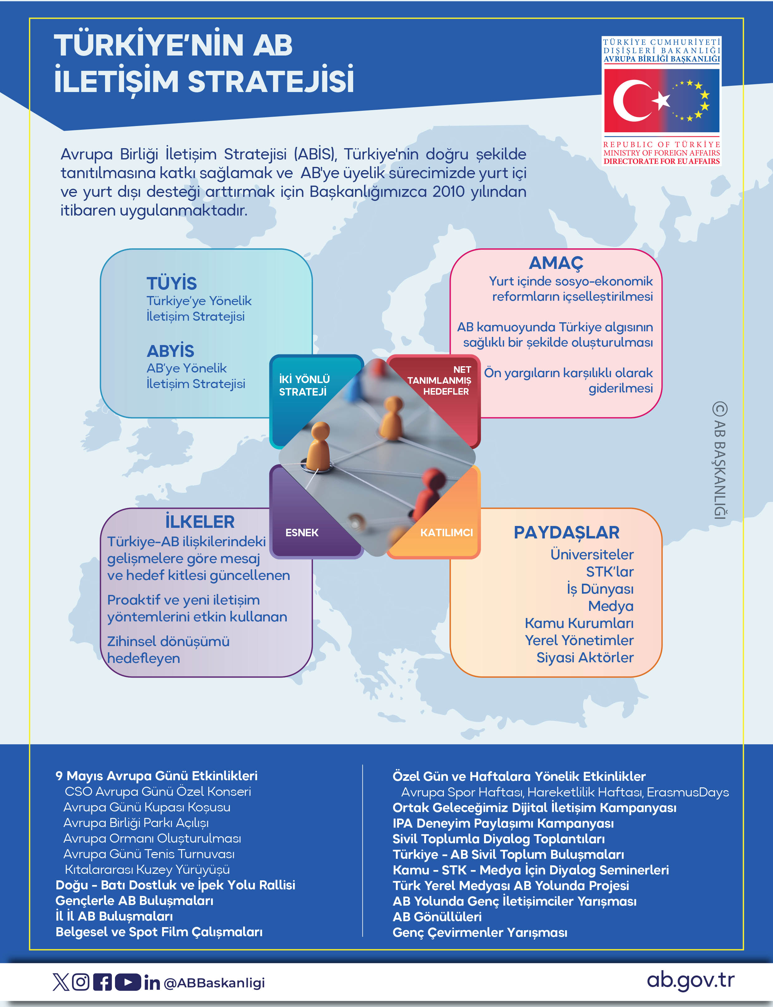 Türkiye'ye ilişkin doğru resme bakılması ve Türkiye ile AB kamuoylarında Türkiye'nin AB üyeliğine desteğin artırılması amacıyla hazırlanan İletişim Stratejisi'nin yurt içi ve yurt dışı olmak üzere iki boyutu bulunmaktadır.
