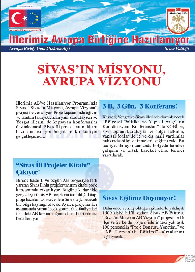 T.C. Avrupa Birliği Bakanlığı tarafından yürütülen ‘İllerimiz Avrupa Birliğine Hazırlanıyor Programı' kapsamında, T.C. Sivas Valiliği'nin, Kayseri Valiliği Dış İlişkiler ve AB Koordinasyon Merkezi, Yozgat Valiliği, Sivas Belediyesi, Sivas Milli Eğitim Müdürlüğü ve Orta Anadolu Kalkınma Ajansı ile ortaklaşa yürütmekte olduğu ‘Sivas'ın Misyonu, Avrupa Vizyonu' Projesi, 6 ayda tamamlanacaktır ve projenin toplam bütçesi 48.198 TL'dir.