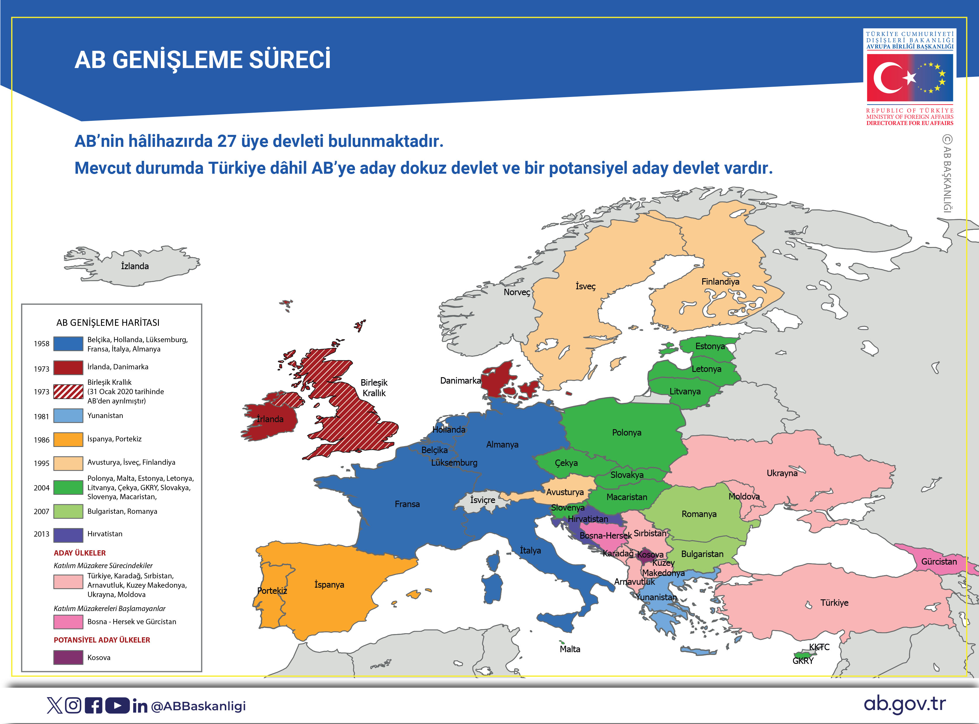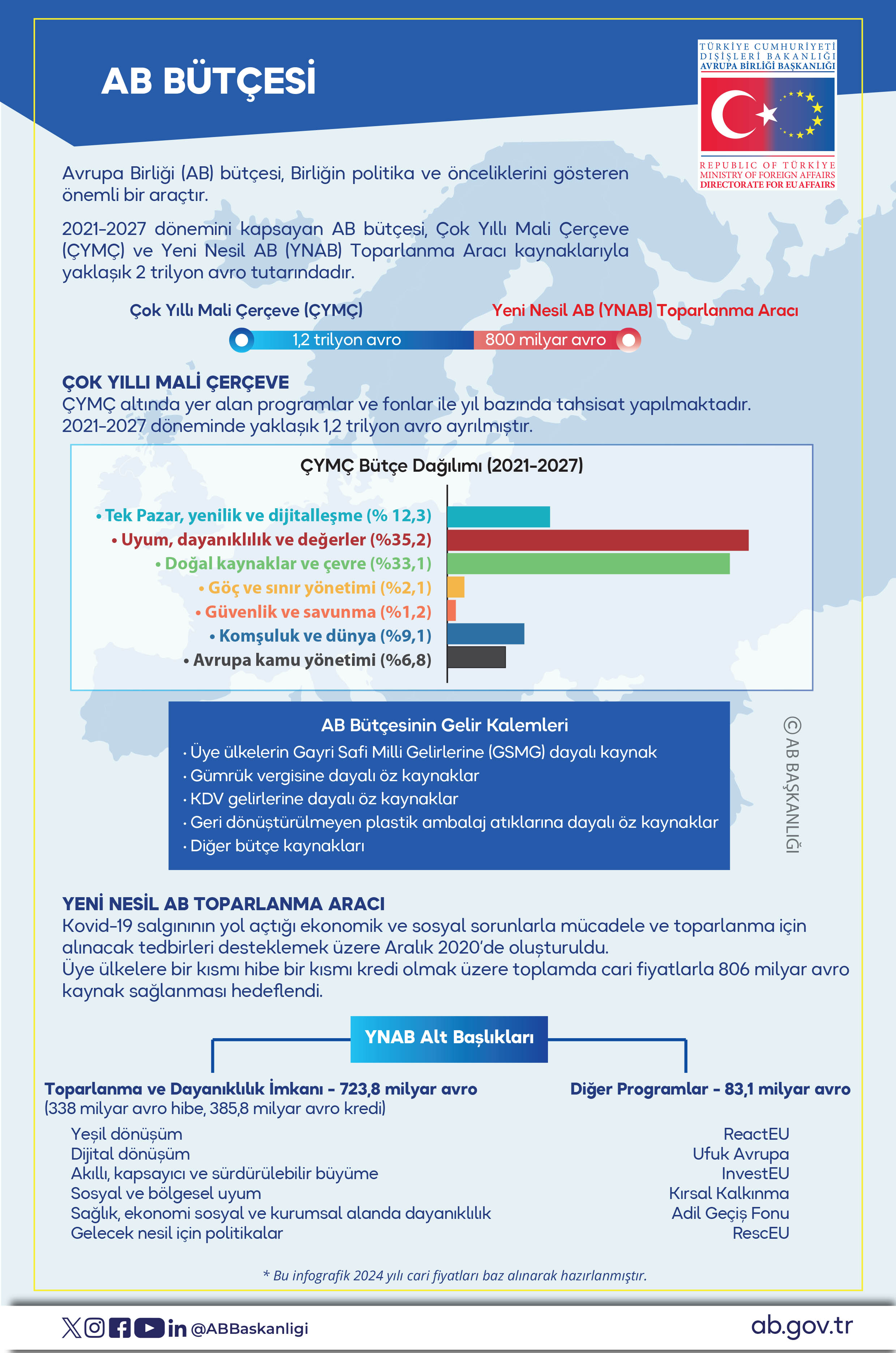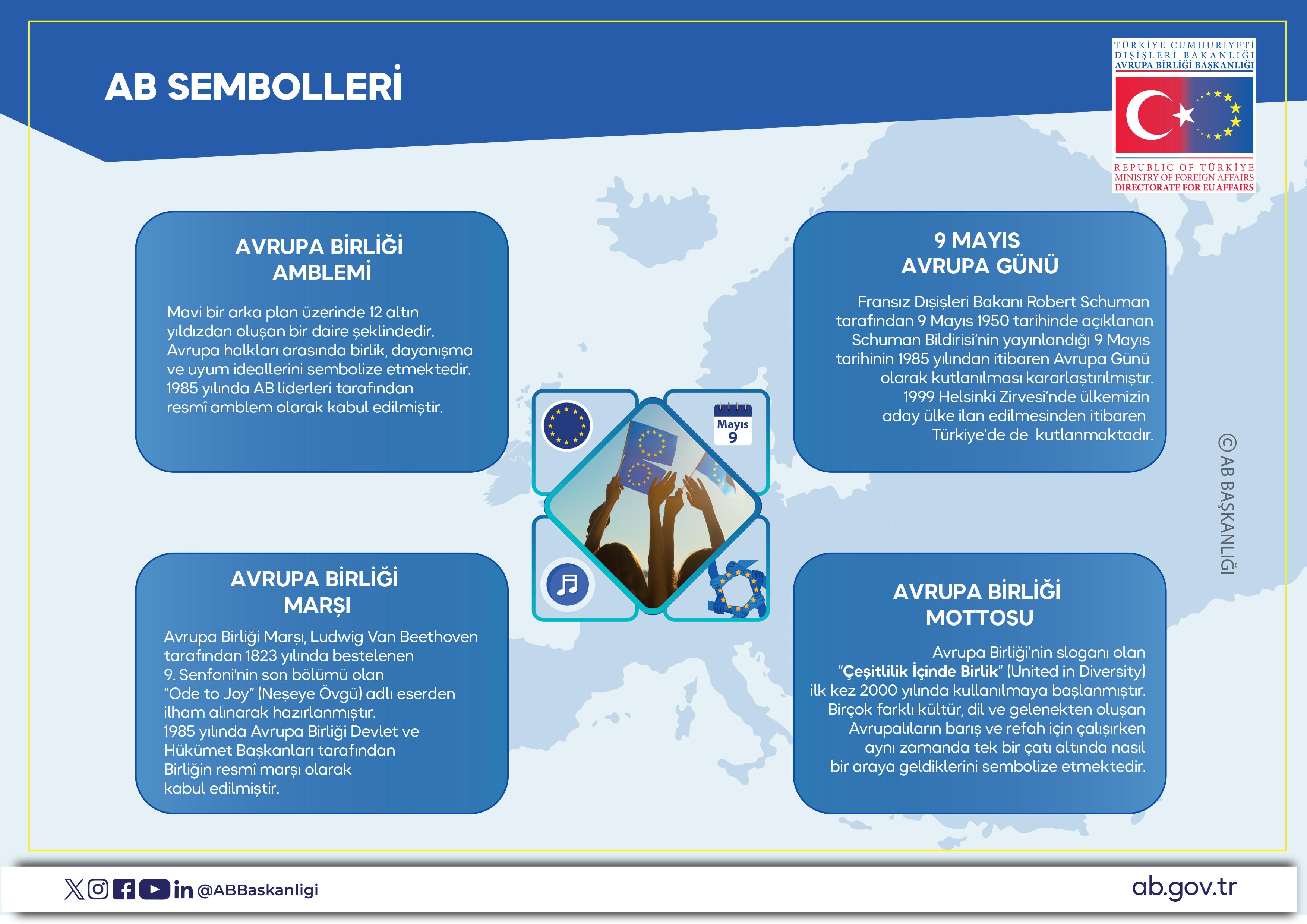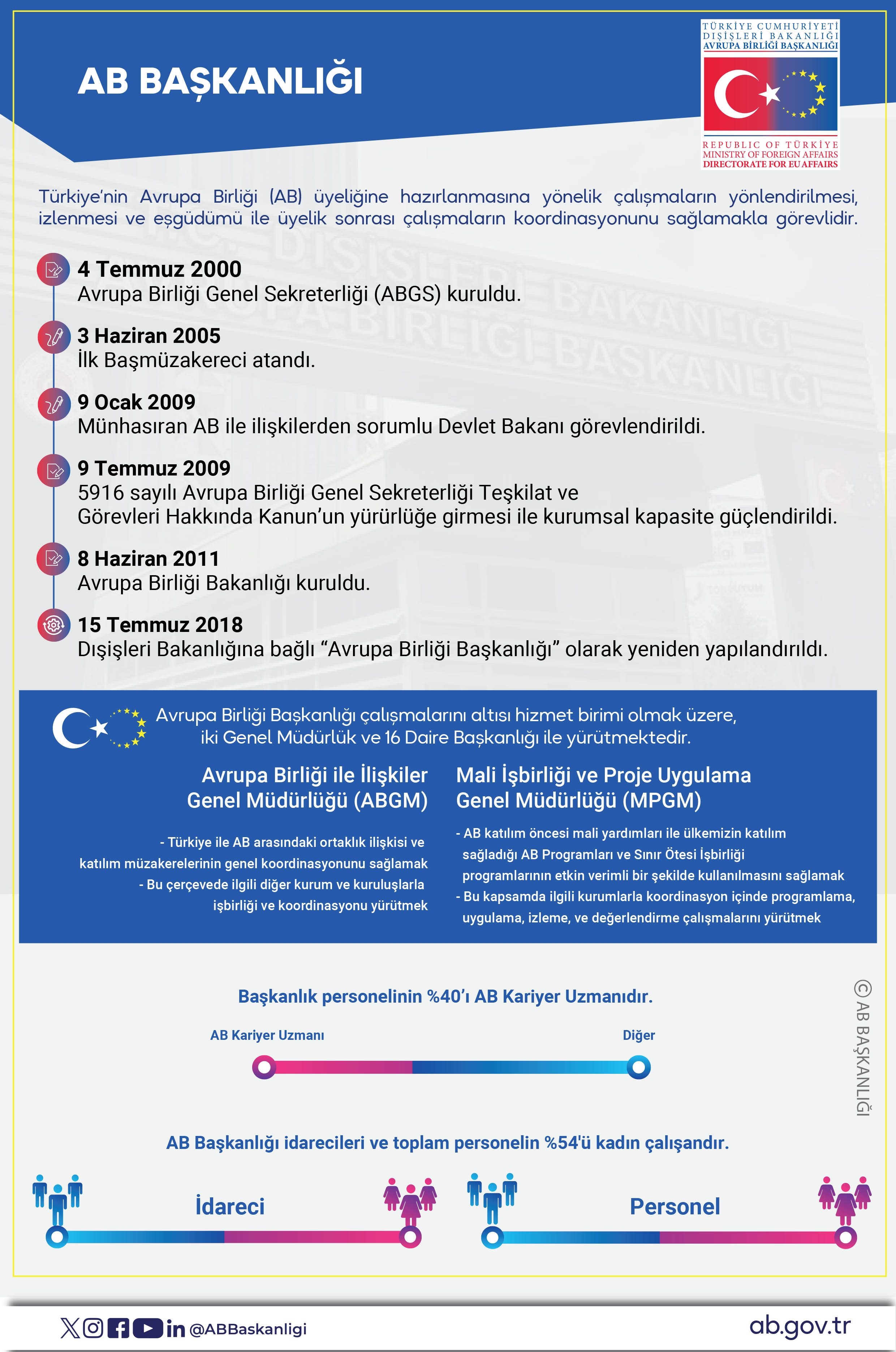 İnfografik serisi, Türkiye’nin AB İletişim Stratejisi (ABİS) çerçevesinde Avrupa Birliği Başkanlığınca oluşturulmuştur. Bu yayın serisi, AB sürecinde rol alan uzmanlar, STK’lar, akademisyenler, medya mensupları ve vatandaşlarımız için AB ve AB sürecimiz kapsamındaki çalışmalara yönelik kullanıcı dostu bir başvuru kaynağı olarak yayına hazırlanmıştır.