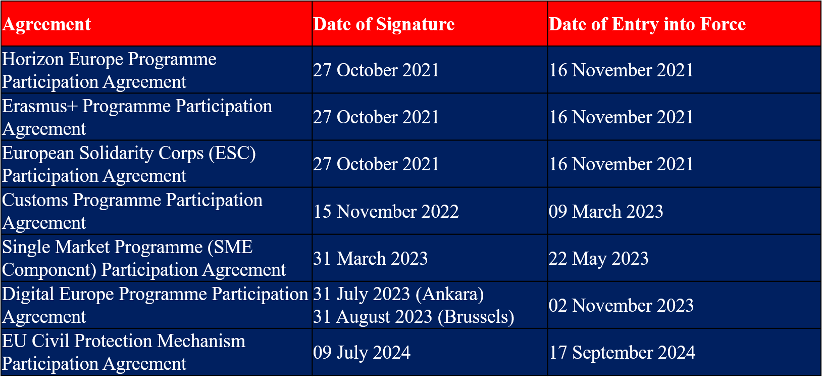 In line with these decisions, letters of intent for participation in the mentioned 13 programmes were sent to the relevant directorates-general of the European Commission. Below is the table detailing the participation agreements and their dates: