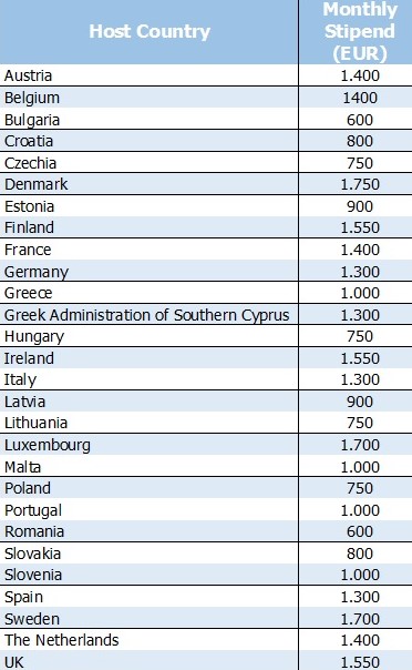 - Monthly stipend (food and drink, accommodation, communication, local transportation, cultural activities, etc.-(varying according to the host EU member country, please see the table below),