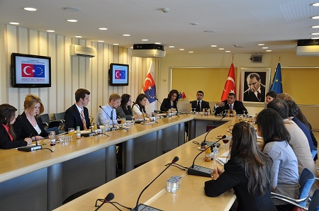 Devlet Bakanlığı Dışişleri Özel Müşaviri Sayın Faruk Kaymakcı, heyete Türkiye'nin AB üyelik süreci, Türkiye'nin Avrupa Birliği İletişim Stratejisi konularında bilgi verdi. Öğrencilerin sorularını da yanıtlayan Kaymakcı, Türkiye'nin AB ile ilişkilerini, üyelik perspektifi ile sürdürmeye kararlı olduğunu belirterek, Avrupa Birliği'nin Türkiye için çağdaşlaşma hedefi doğrultusunda önemli bir referans olduğunu ve Türkiye'nin üyeliğinin hem Avrupa Birliği hem de Türkiye açısından bir kazan-kazan ilişkisi olacağını vurguladı.