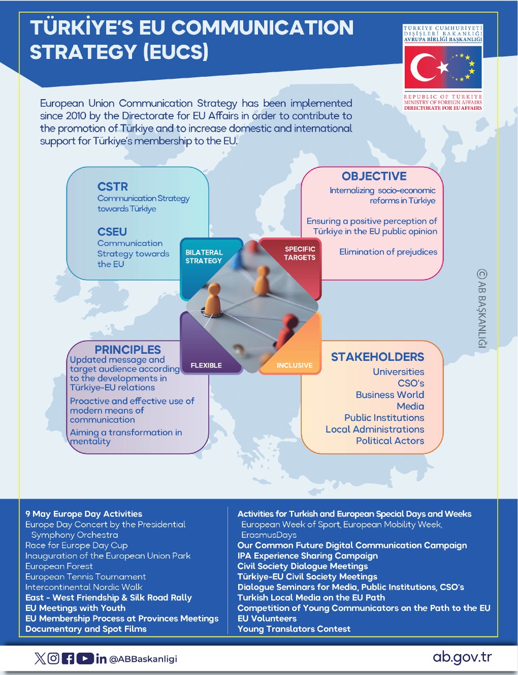 The Communication Strategy for Türkiye aims to increase the support of the Turkish people for the reforms by strengthening their conviction that the EU accession process is a modernisation and democratisation project which will promote living standards in all areas. The Communication Strategy for the EU aims to provide facts on Türkiye to help shaping a more accurate perception among the EU public. This part of the Strategy will help reinstitute mutual trust and set forth Türkiye's commitment, self-confidence and sincerity in the EU accession process.