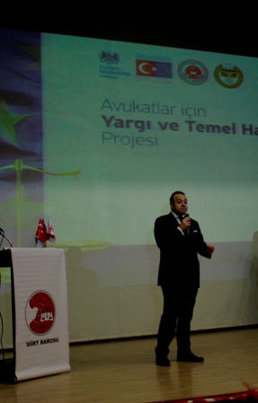Avrupa Birliği Bakanlığı’nın Adalet Bakanlığı ve Türkiye Barolar Birliği ile işbirliği içerisinde yürüttüğü, İngiltere Büyükelçiliği tarafından Avrupa’yı Birleştirme Programı kapsamında desteklenen “Avukatlar için Yargı ve Temel Haklar Projesi’nin dördüncü eğitiminin kapanış töreni 16 Şubat 2013 tarihinde Siirt’te, 200’ü aşkın katılımcıyla gerçekleşti. İki gün süren eğitim programının kapanışına, Avrupa Birliği Bakanı ve Başmüzakereci Egemen BAĞIŞ, Siirt Valisi Ahmet AYDIN, Siirt Belediye Başkanı Selim Sadak, Siirt Milletvekili ve Türkiye - Avrupa Birliği Karma Parlamento Komisyonu Eş Başkanı Afif DEMİRKIRAN, Siirt Milletvekili Osman ÖREN, Türkiye Barolar Birliği Başkan Yrd. Av. Berra BESLER, Avrupa Birliği Bakanlığı Müsteşar Yardımcısı Dr. Mehmet CANGİR, Avrupa Birliği Bakanlığı Siyasi İşler Başkanı Ege ERKOÇAK ve Siirt Barosu Başkanı Av. Mehmet Cemal ACAR katıldı.