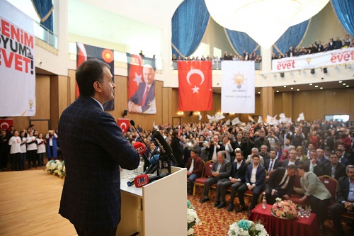 Sistem krizlerini aşmak üzere yeni bir yapının ortaya çıkmasını istediklerini anlatan AB Bakanı Ömer Çelik, "Türkiye'nin geleceği için istiyoruz. O sebeple bu bir parti meselesi değildir. Bu bir devlet meselesidir. Milli iradenin geleceğinin meselesidir. Önümüzdeki meydan okumalara karşı daha güçlü bir şekilde ilerleyebilmesi için sistem krizleri çerçevesinde oluşturulan fay hatlarından bir takım vesayet odaklarının kendilerine pay çıkaramamaları için, bu ülkenin demokrasisinin, ekonomisinin tökezletilmemesi için, daha kontrollü hükümet sistemine ihtiyaç duyduğumuz için sistem değişikliğine 'evet' diyoruz." ifadesini kullandı.