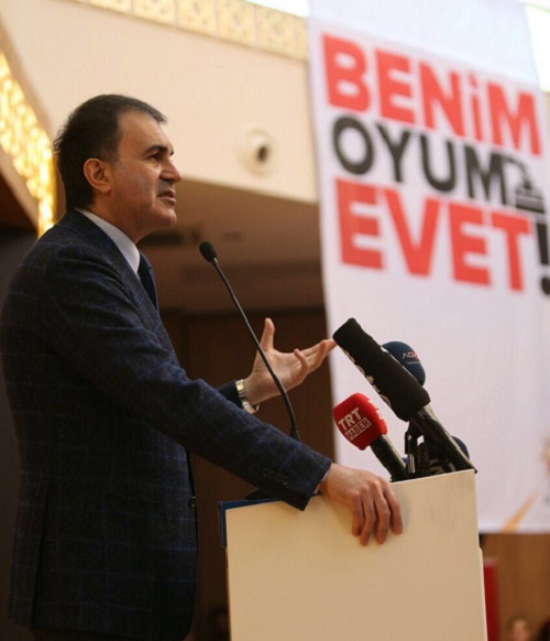 Anayasa değişikliğine ilişkin referandumun 16 Nisan'da gerçekleştirileceğine dair Yüksek Seçim Kurulunun (YSK) açıklama yaptığını anımsatan AB Bakanı Ömer Çelik, "Bu tarihi fırsatı kaçırmamalıyız. İlk defa sivillerin yaptığı bu şekilde büyük bir sistem değişikliğiyle birlikte Türkiye'nin önünü açacak bu fırsatı kaçırmamalıyız. Bazen 'sistem yanlış birinin eline geçerse' deniliyor. Vatandaşın yüzde 51'inin vatandaşın değerleri, milletin geleneğiyle kavga edecek birinin üzerinde uzlaşması mümkün değil. Yüzde 50'nin üzerine oy alacak alan kimse milletin iradesi, Türkiye özlemi, gelecek özlemiyle uyumlu birisi olacaktır." ifadesini kullandı.
