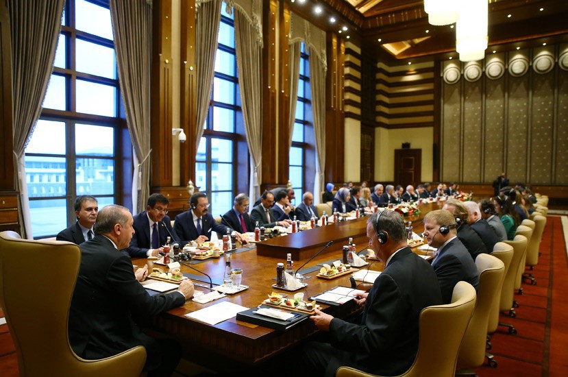 Cumhurbaşkanımız Sayın Recep Tayyip Erdoğan’ın, Amerikan Türk Konseyi ve ABD Ticaret Odası heyetini kabulünde, Avrupa Birliği Bakanı ve Başmüzakereci Ömer Çelik'in yanı sıra, Ekonomi Bakanı Nihat Zeybekci, Savunma Sanayii Müsteşarı İsmail Demir, Cumhurbaşkanlığı Sözcüsü İbrahim Kalın, Türkiye Odalar ve Borsalar Birliği (TOBB) Başkanı Rifat Hisarcıklıoğlu ile diğer yetkililer hazır bulundu.