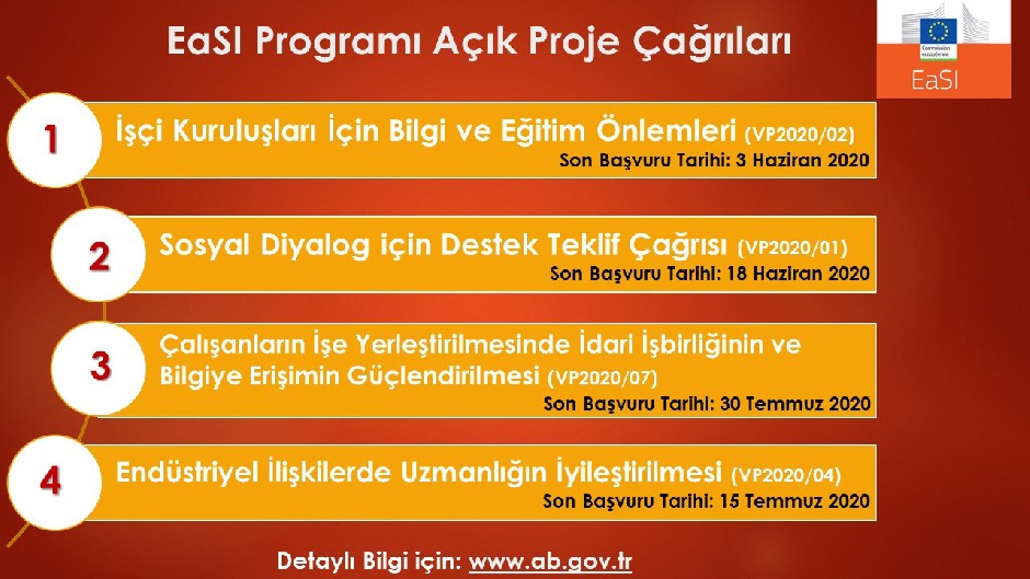 Başkanlığımızın ülkemizdeki koordinasyonundan sorumlu olduğu İstihdam ve Sosyal Yenilik (EaSI) Programı, AB'de nitelikli ve sürdürülebilir istihdamın sağlanması, yeterli sosyal korumanın temini, sosyal dışlanma ve yoksullukla mücadele ile çalışma şartlarının iyileştirilmesi hususlarına destek verilmesi amacıyla Avrupa Komisyonu tarafından uygulanan Birlik Programıdır. Program; istihdam, sosyal işler ve içerme alanlarındaki eylemler için AB ve ulusal düzeyde koordinasyonun güçlendirilmesini, işgücü piyasası politikaları ve yeterli sosyal koruma sistemlerinin geliştirilmesinin desteklenmesini, AB mevzuatının modernize edilmesi ve etkili uygulanmasının sağlanmasını, coğrafi hareketliliğin teşvik edilmesi ve istihdam fırsatlarının çoğaltılmasını, özel itina gösterilmesi gereken gruplar ile mikro girişimlerin mikrofinans imkânlarına erişimlerinin arttırılmasını ile sosyal girişimlerin finansmana erişimlerinin desteklenmesini hedeflemekte ve bu doğrultuda ülkemizin de faydalanabileceği teklif çağrılarına çıkılmaktadır. Program kapsamında halihazırda açık olan dört teklif verme çağrısı bulunmaktadır. Bu çağrılar aşağıda sıralanmıştır: