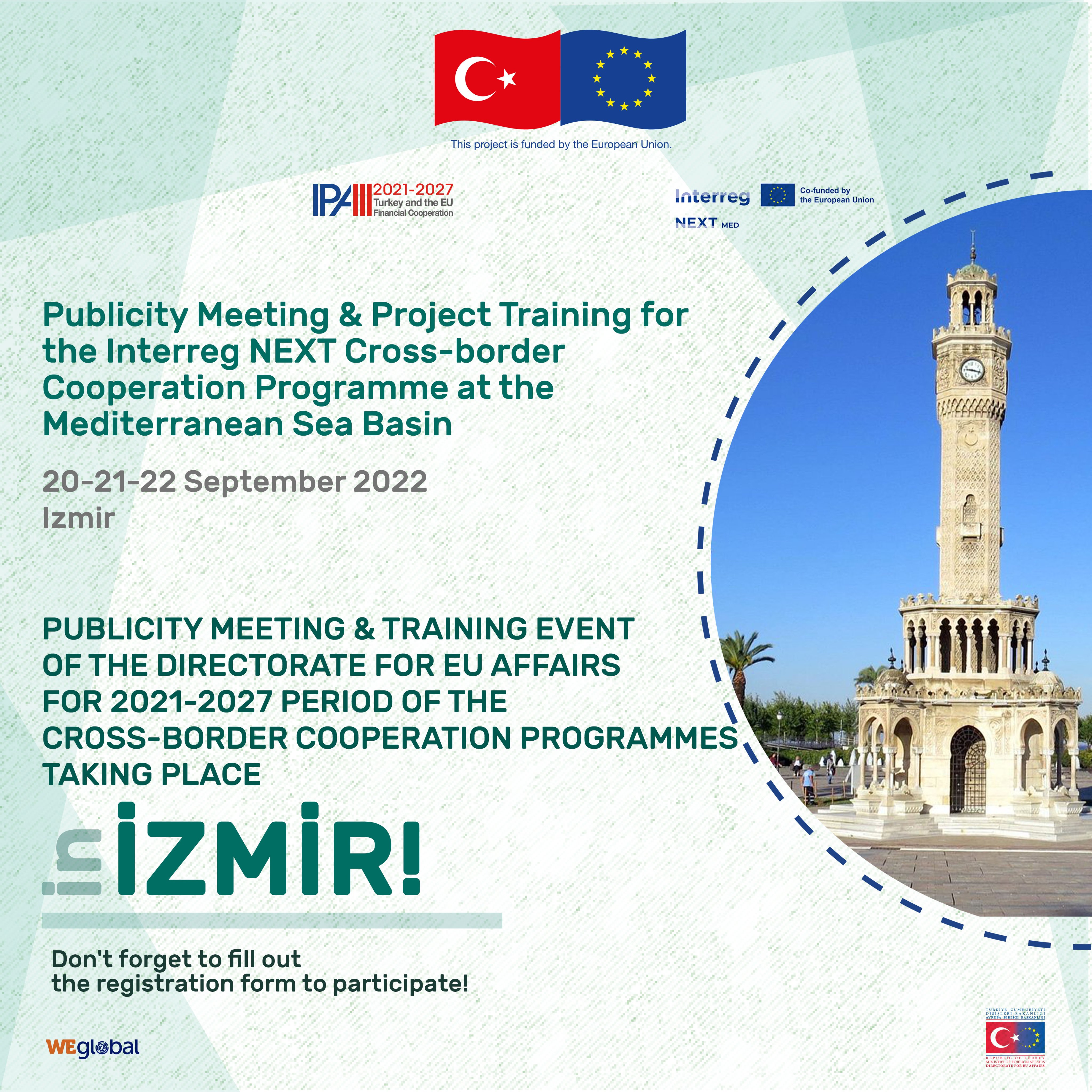 The first one of the promotional activities and project trainings for the 2021-2027 period of the Interreg NEXT Cross-border Cooperation Programme in the Mediterranean Sea Basin, which covers 21 provinces from Turkey, and for which the Ministry of Foreign Affairs, Directorate for EU Affairs is responsible for the management and implementation as the Managing Authority in our country, will be held in İzmir on 20-21-22 September 2022.