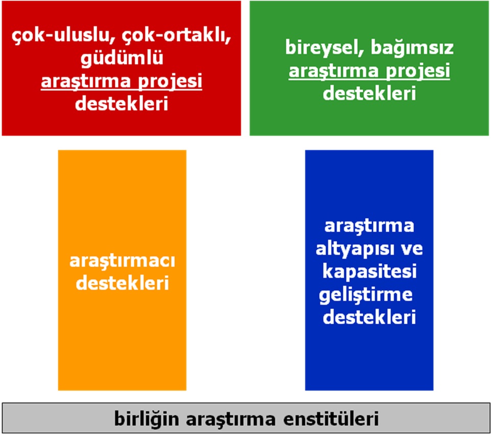 Üstteki iki program olan İşbirliği ve Fikirler alt başlıklarıyla araştırma ve teknoloji geliştirme projelerine fon sağlanırken alttaki programlarla, bu araştırmaları hayata geçirebilmek için gerekli olan diğer unsurlara, yani araştırmacı ve araştırma altyapısı unsurlarına destek verilmiştir.