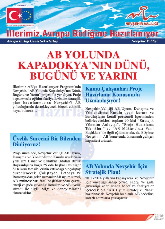T.C. Avrupa Birliği Bakanlığı tarafından yürütülen ‘İllerimiz Avrupa Birliğine Hazırlanıyor Programı' kapsamında, T.C Nevşehir Valiliği'nin Nevşehir Belediyesi, Nevşehir İl Özel İdaresi, Nevşehir Milli Eğitim Müdürlüğü, Nevşehir İl Emniyet Müdürlüğü, Nevşehir Üniversitesi; Acıgöl, Avanos, Derinkuyu, Gülşehir, Hacıbektaş, Kozaklı ve Ürgüp Kaymakamlığı ve Ahiler Kalkınma Ajansı ile ortaklaşa yürütmekte olduğu ‘AB Yolunda Kapadokya'nın Dünü, Bugünü ve Yarını' Projesi, 6 ayda tamamlanacaktır ve projenin toplam bütçesi 72.030 TL'dir.