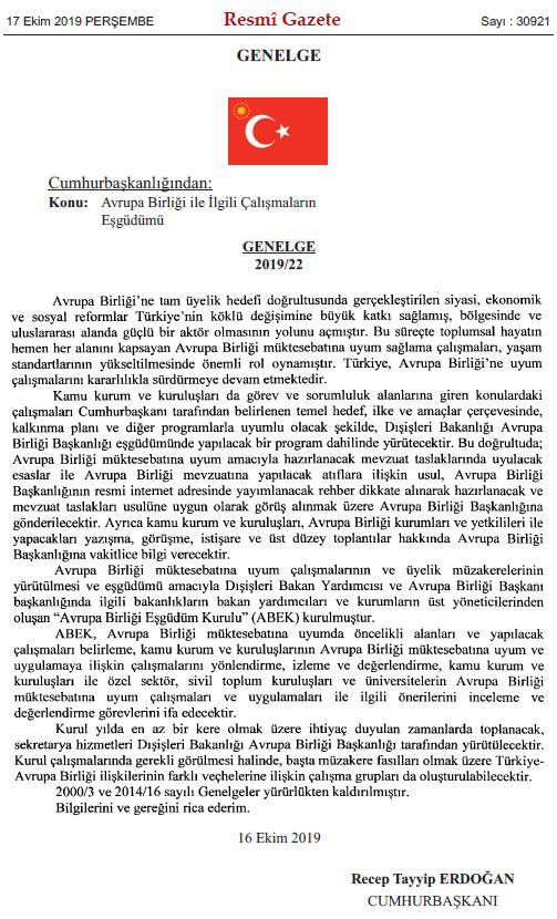 Türkiye’nin Avrupa Birliği’ne uyum çalışmalarının eşgüdüm içerinde yürütülmesini amaçlayan 2019/22 sayılı Cumhurbaşkanlığı Genelgesi 17 Ekim 2019 tarihli ve 30921 sayılı Resmi Gazete’de yayımlanarak yürürlüğe girmiştir.
