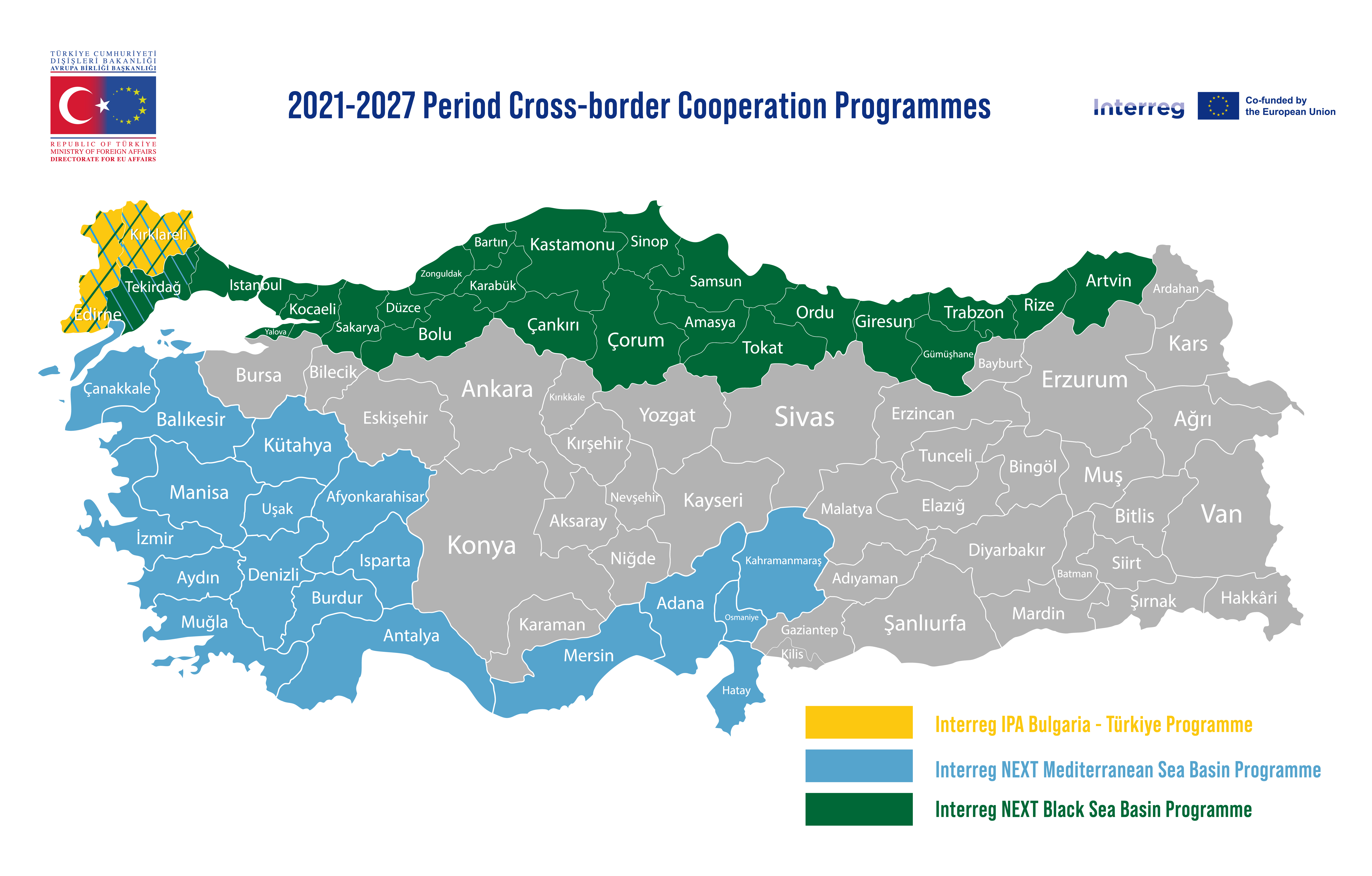 A total of 79 million Euros under the Bulgaria-Türkiye Programme in which Türkiye participated in the 2003-2006, 2007-2013 and 2014-2020 periods and 41 million Euros under the 2007-2013 and 2014-2020 periods of the Black Sea Basin Programme have been allocated for projects of the Programmes. Under these two programmes, a total of 310 projects have been successfully implemented. In addition to these two programmes, Türkiye also participated in the Interreg NEXT Mediterranean Sea Basin Programme for the first time in the 2021-2027 period. Our Directorate is the National Authority of the Cross-border Cooperation Programmes in which Türkiye participates. 43 provinces in the Black Sea, Marmara, Aegean and Mediterranean regions can benefit from the grant opportunities under the calls for project proposals announced under the programmes.