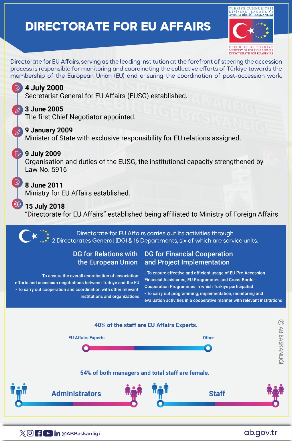 Directorate for EU Affairs, serving as the leading institution at the forefront of steering the accession process is responsible for monitoring and coordinating the collective efforts of Türkiye towards the membership of the European Union (EU) and ensuring the coordination of post-accession work.