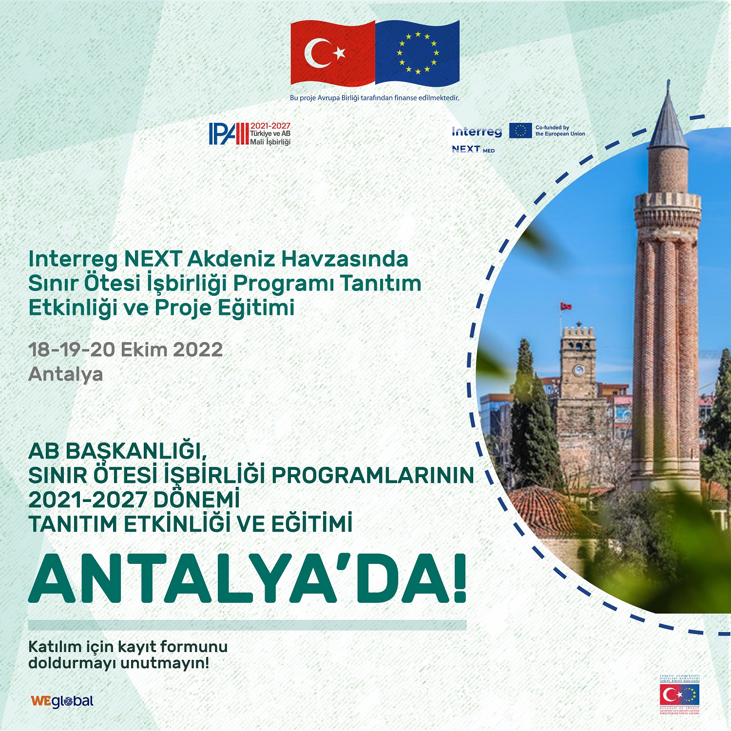 Dışişleri Bakanlığı Avrupa Birliği Başkanlığının uygulanmasından ve yönetiminden sorumlu olduğu ve Türkiye’den 21 ili kapsayan Interreg NEXT Akdeniz Havzasında Sınır Ötesi İşbirliği Programının 2021-2027 dönemine yönelik tanıtım etkinlikleri ve proje eğitimlerinin ikincisi 18-19-20 Ekim 2022 tarihlerinde Antalya’da gerçekleştirilecektir.