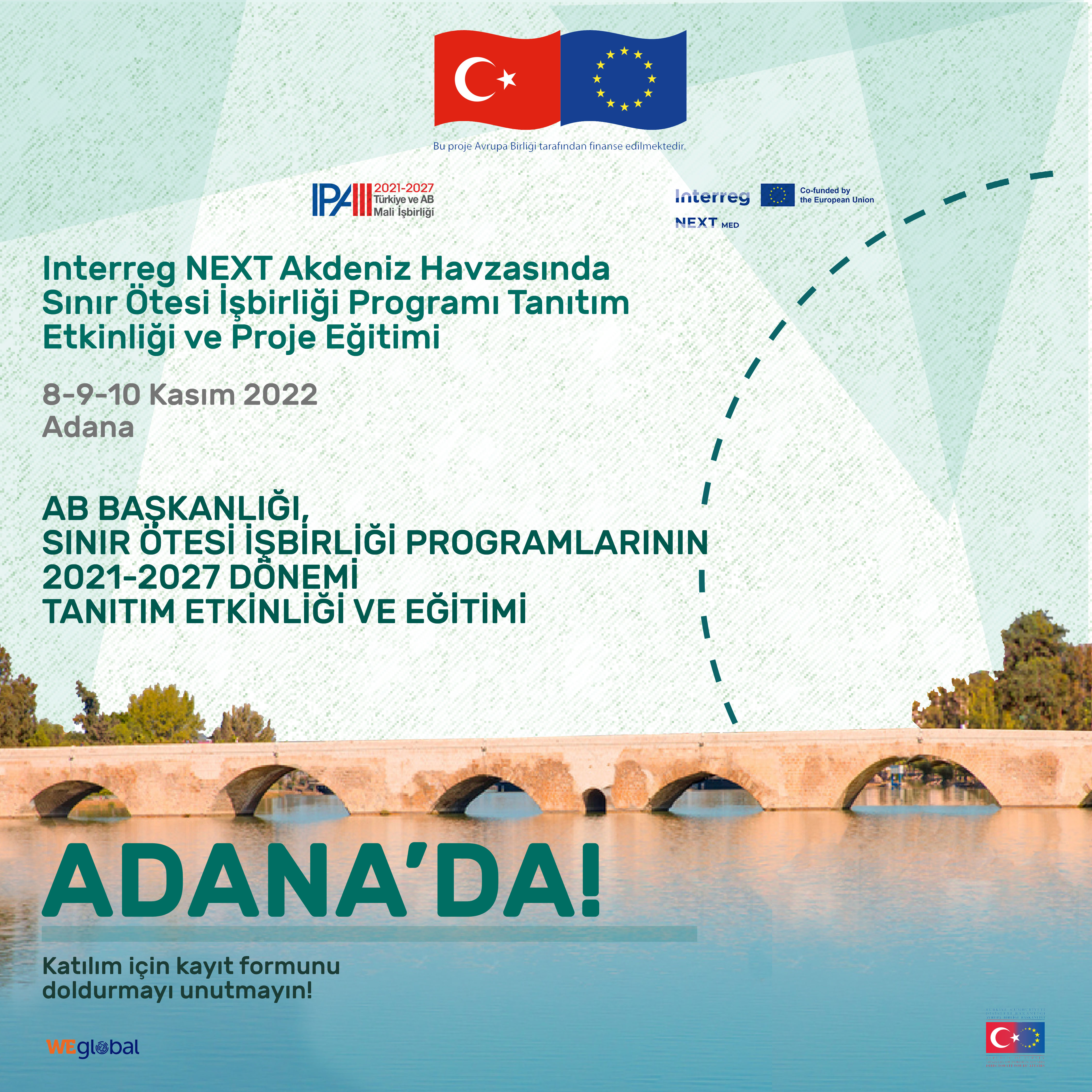 Dışişleri Bakanlığı Avrupa Birliği Başkanlığının ülkemizdeki yönetimi ve uygulanmasından sorumlu olduğu ve Türkiye’den 21 ili kapsayan Interreg NEXT Akdeniz Havzasında Sınır Ötesi İşbirliği Programının 2021-2027 dönemine yönelik tanıtım toplantıları ve proje eğitimlerinin üçüncüsü 8-9-10 Kasım 2022 tarihlerinde Adana’da gerçekleştirilecektir.