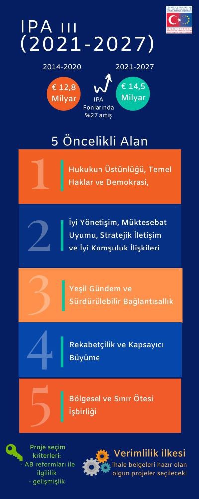 IPA’nın 2021 – 2027 yıllarını kapsayan III. Dönemi de diğer dönemler gibi Türkiye’nin AB müktesebatına uyumuna ve müktesabatın uygulamasına yönelik kapasitesinin geliştirilmesi ile ekonomik ve sosyal uyuma yönelik kapasitelerinin oluşturulması hedefleri çerçevesinde yürütülecektir. Ülke tahsisatının olmadığı yeni dönemde yararlanıcı ülkeler için toplamda 14.2 milyar Avro fon adil paylaşım ilkesi ile tahsis edilmiştir.