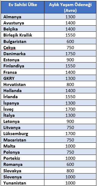 • Yaşam giderleri (yeme-içme, konaklama, iletişim, yerel ulaşım, kültürel faaliyetler, vb.-gidilecek ülkeye göre değişmekte ve bursun süresine göre hesaplanmaktadır, lütfen aşağıdaki tabloyu inceleyiniz),