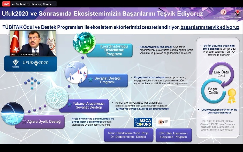 Dışişleri Bakan Yardımcısı ve AB Başkanı Büyükelçi Faruk Kaymakcı, TOBB Başkanı M. Rifat Hisarcıklıoğlu ve TÜBİTAK Başkanı Prof. Dr. Hasan Mandal’ın konuşmacı olarak katılım sağladıkları toplantıda, Türkiye-AB İlişkileri ekseninde AB Programları, 2021-2027 dönemi Ufuk Avrupa Programı ve 2014-2020 dönemi Ufuk 2020 Programının son ve en önemli çağrısı olma niteliğini taşıyan 1 milyar Avro bütçeli Avrupa Yeşil Mutabakat Çağrısı gündeme alındı.