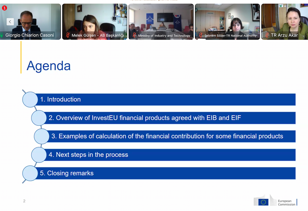 Türkiye'nin InvestEU (YatırımAB) Programına katılımına ilişkin müzakere toplantısı Avrupa Komisyonu Ekonomik ve Mali İşler Genel Müdürlüğü InvestEU ve Finansal Kurumlar Direktörü Giorgio Chiarion Casoni, ve AB Başkanlığından Birlik Programları ve Sınır Ötesi İşbirliği Daire Başkanı Dr. Şebnem SÖZER eş başkanlığında, Sanayi ve Teknoloji Bakanlığından temsilcilerin katılımlarıyla 22 Mart 2022 tarihinde çevrimiçi olarak gerçekleştirildi.